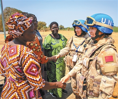 中国第十一批赴南苏丹(朱巴)维和步兵营女兵与当地妇女友好交谈。